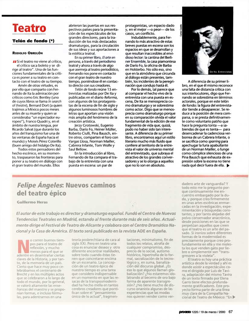 Amén de otras virtudes, es por ello que comparto con Fernando de Ita la admiración por críticos como Eric Bentley (uno de cuyos libros se llama In search of theatre), Bernard Dort (a quien trajimos a México pocos meses antes de su muerte y quien se consideraba “un espectador europeo”), Franco Quadri y, en el ámbito de nuestra lengua, por Ricard Salvat (que durante los años del franquismo fue una de las ventanas de España hacia el mundo) y Moisés Pérez Coterillo (buen amigo del hidalgo De Ita).