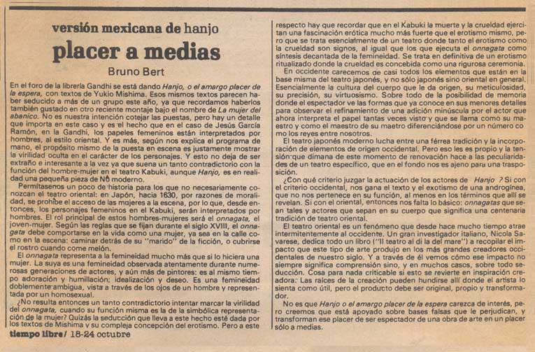 En el foro de la librería Gandhi se está dando Hanjo, o el amargo placer de la espera, con textos de Yukio Mishima. Esos mismos textos parecen haber seducido a más de un grupo este año, ya que recordamos haberlos también gustado en otro reciente montaje bajo el nombre de La mujer del abanico. No es nuestra intención cotejar las puestas, pero hay un detalle que importa en este caso y es el hecho que en el caso de Jesús García Ramón, en la Gandhi, los papeles femeninos están interpretados por hombres, al estilo oriental. Y es más, según nos explica el programa de mano, el propósito mismo de la puesta en escena es justamente mostrar la virilidad oculta en el carácter de los personajes. Y esto no deja de ser extraño e interesante a la vez ya que suena un tanto contradictorio con la función del hombre-mujer en el teatro Kabuki, aunque Hanjo, es en realidad una pequeña pieza de No moderno.