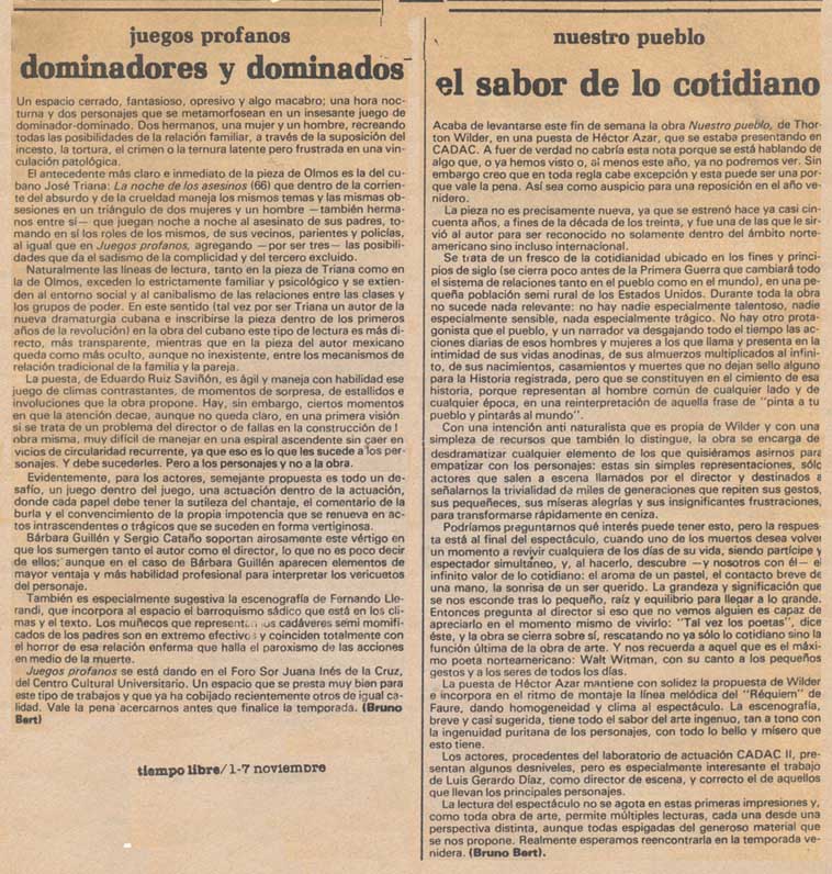 Acaba de levantarse este fin de semana la obra Nuestro pueblo, de Thorton Wilder, en una puesta de Héctor Azar, que se estaba presentando en CADAC. A fuer de verdad no cabría esta nota porque se está hablando de algo que, o ya hemos visto o, al menos este año, ya no podremos ver. Sin embargo creo que en toda regla cabe excepción y esta puede ser una porque vale la pena. Así sea como auspicio para una reposición en el año venidero.