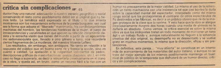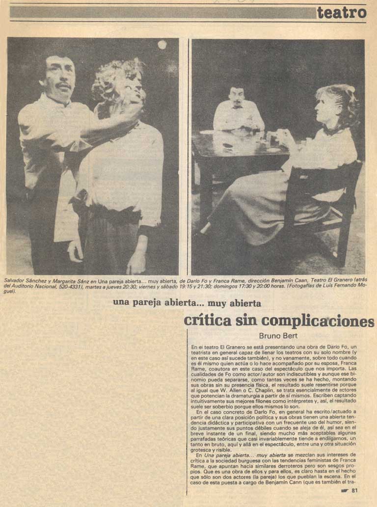 En Una pareja abierta... muy abierta se mezclan sus intereses de crítica a la sociedad burguesa con las tendencias feministas de Franca Rame, que apuntan hacia similares derroteros pero son sesgos propios. Que es una obra de ellos y para ellos, es claro hasta en el hecho que sólo son dos actores (la pareja) los que pueblan la escena. En el caso de esta puesta a cargo de Benjamín Cann (que es también el traductor) [p. 81] hay una natural adecuación a nuestro espacio geográfico y social conservando el resto como posiblemente debió ser el original que no hemos leído. La temática está expresada en el título lo que intenta mostrarnos son los mecanismos enfermos de la pareja burguesa, sea cual sea la forma que adopte el "liberado" matrimonio, los condicionamientos machistas del hombre, las tendencias histéricas de la mujer, el juego de intrascendencias y banalidades en que apoyan su relación claramente clasista y la estrecha visión que tienen del mundo a partir de un egocentrismo sadomasoquista que, llevado a otro género y tono, nos recordaría ciertos fragmentos de La mudanza, del maestro Vicente Leñero.