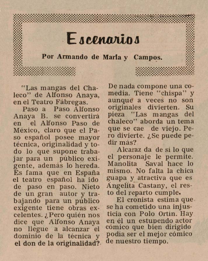 Paso a Paso Alfonso Anaya B. se convertirá en el Alfonso Paso de México, claro que el Paso español posee mayor técnica, originalidad y todo lo que supone trabajar para un público exigente, además lo hereda. Es fama que en España el teatro español ha ido de paso en paso. Nieto de un gran autor y trabajando para un público exigente tiene obras excelentes. ¿Pero quién nos dice que Alfonso Anaya no llegue a alcanzar el dominio de la técnica y el don de la originalidad? De nada compone una comedia. Tiene "chispa" y aunque a veces no son originales divierten. Su pieza Las mangas del chaleco aborda un tema que se cae de viejo. Pero divierte. ¿Se puede pedir más?