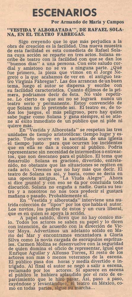 Cómo citar Maria y Campos, Armando de. "Vestida y alborotada, de Rafael Solana, en el Teatro Fábregas". El Heraldo de México, 1966. Reseña Histórica del Teatro en México 2.0-2.1. Sistema de información de la crítica teatral, <criticateatral2021.org>